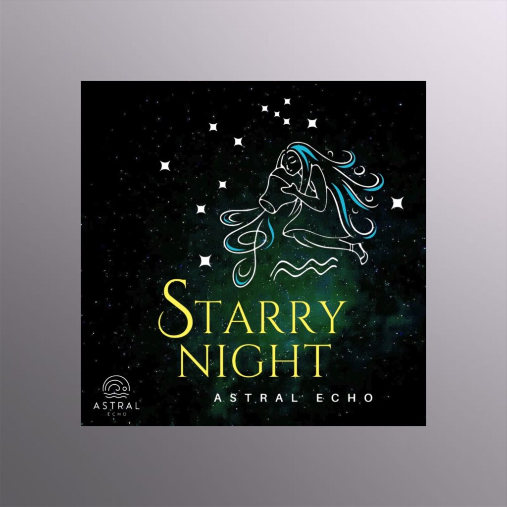 水瓶座の女神が水瓶から音楽を注ぐ姿が描かれており、まるで星空の下で心地よいメロディが流れてくるような幻想的な雰囲気を醸し出すデザインのステッカーです。